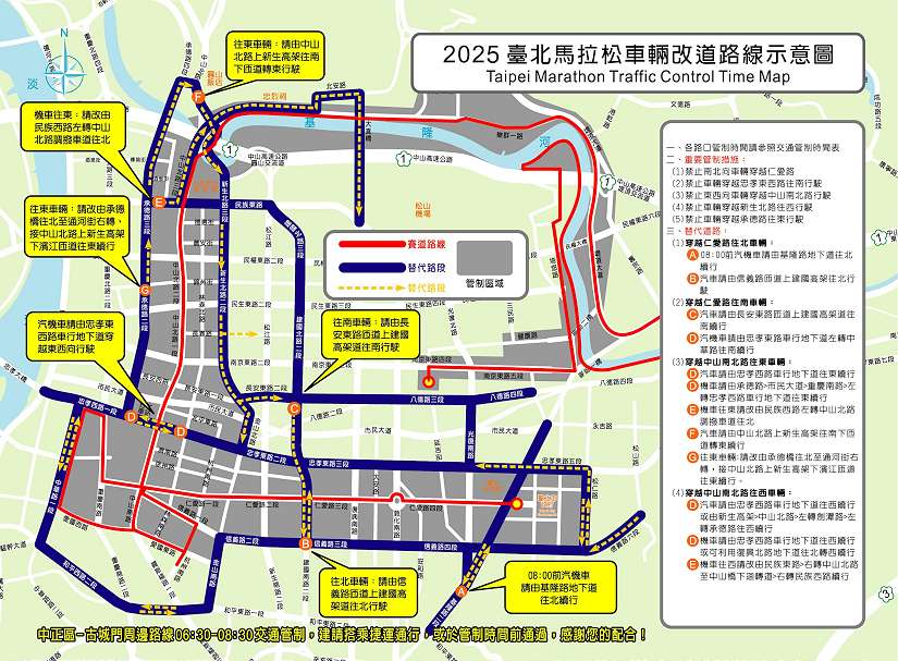 為維護交通秩序與活動安全,臺北市政府警察局將於前揭路段實施交通管制,禁止人、車(含自行車)通行,管制範圍及時間(如附圖-2025臺北馬拉松交通管制時間圖)。活動期間,管制道路範圍內之公車候車處暫停服務,民眾如欲查詢公車改道路線,請利用臺北市公共運輸處網站( http://www.pto.gov.taipei/ )查詢相關資訊。