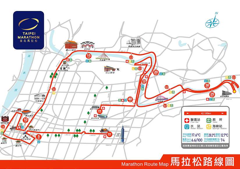 「2025臺北馬拉松」主賽事訂於114年12月21日(星期日)5時至13時,於市民廣場(起點)、臺北田徑場(終點)舉辦,活動將於上午6時30分起跑,沿線行經仁愛路、信義路、杭州南路、愛國東(西)路、中華路、忠孝西路、重慶南路、凱達格蘭大道、中山南(北)路、北安路、明水路、樂群一路、堤頂大道、環東大道、麥帥二橋、麥帥一橋、塔悠路、南京東路四、五段等市區道路,及南湖左岸河濱公園、成美左岸河濱公園、迎風河濱公園及觀山河濱公園自行車道,參加人數共計2萬8,000人。