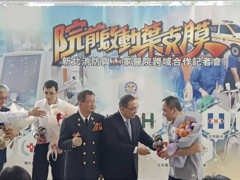 新北市侯友宜市長於今17日上午9時30分在台北慈濟醫院正門戶外廣場主持「院前啟動葉克膜-新北消防與13間醫院跨域合作」記者會,為消防局攜手北北桃急救責任醫院合作推動「院前啟動葉克膜」機制,對於提升院外心跳停止(OHCA)患者的康復率將有重大突破與成效。