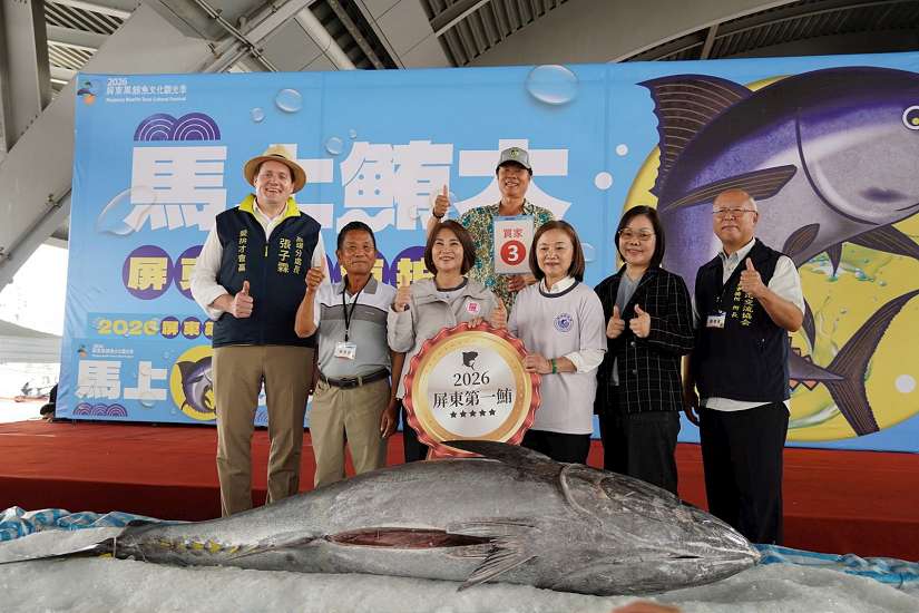 屏東黑鮪魚季邁入第26年,琉球籍漁船「富漁慶2號」不僅捕獲屏東第一鮪,更是台灣第一鮪,(8)日在東港魚市場舉行拍賣會,由縣長周春米擔任拍賣官,最後由佳珍海產餐廳與澎坊股份有限公司共同競標成功,以每公斤1萬600元得標、總價201萬4,000元,每公斤價格破去年紀錄,現場響起掌聲與歡呼聲。