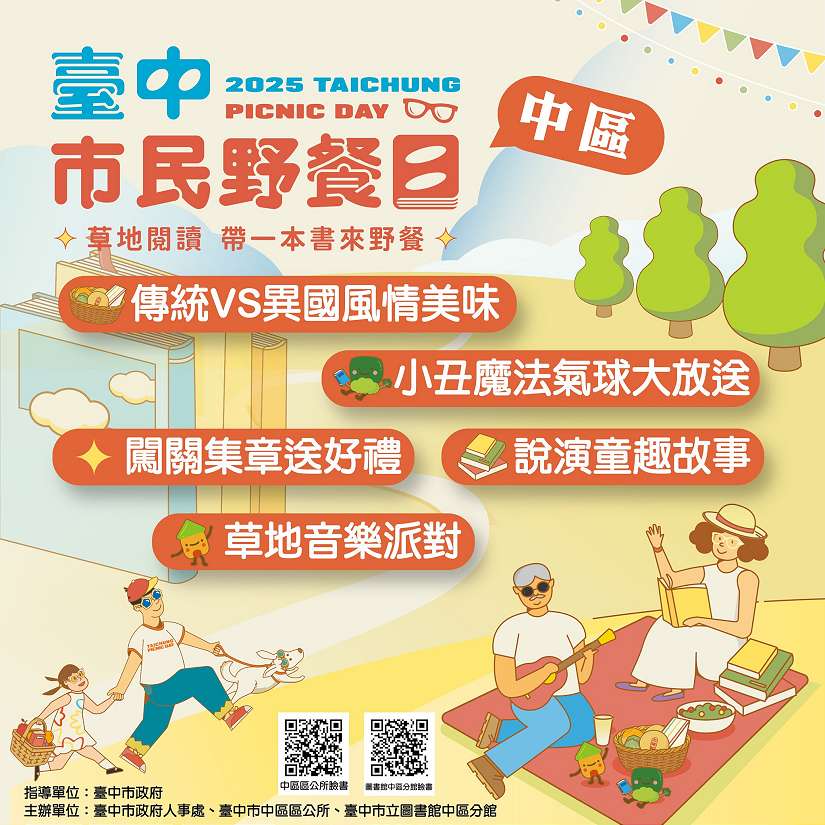 「2025台中市民野餐日」將於11月2日(星期日)盛大登場!今年呼應「台中綠美圖」試營運,以「草地閱讀」為主題,於全市29個行政區同步舉行;中區場次在台中公園(近平等街口)熱閙展開。活動由台中市政府人事處及中區區公所主辦,市立圖書館中區分館協辦,以閱讀為核心,結合中區舊城文化與新住民特色,打造一場以「新舊多元文化,讀見彼此」為主軸的戶外盛會,邀請市民攜家帶眷、呼朋引伴在綠意與陽光中,享受閱讀與交流的美好時光。
