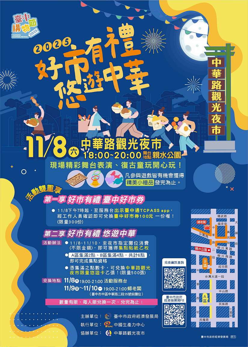 經發局提到,市府與台中夜市的老品牌中華路觀光夜市管理委員會攜手合作,額外加碼舉辦「好市有禮 悠遊中華」活動,自11月8日至10日止,為期3天,民眾只要到中華路觀光夜市消費,不限金額即可獲得集點貼紙1枚,集滿6枚貼紙,就能免費兌換夜市專屬悠遊卡1張,限量500份,數量有限、兌換要快!另外,11月8日在中華路上的親水公園還有活力豐富的舞台表演,以及免費體驗手作棉花糖、彈珠台和套圈圈等古早味童趣遊戲。