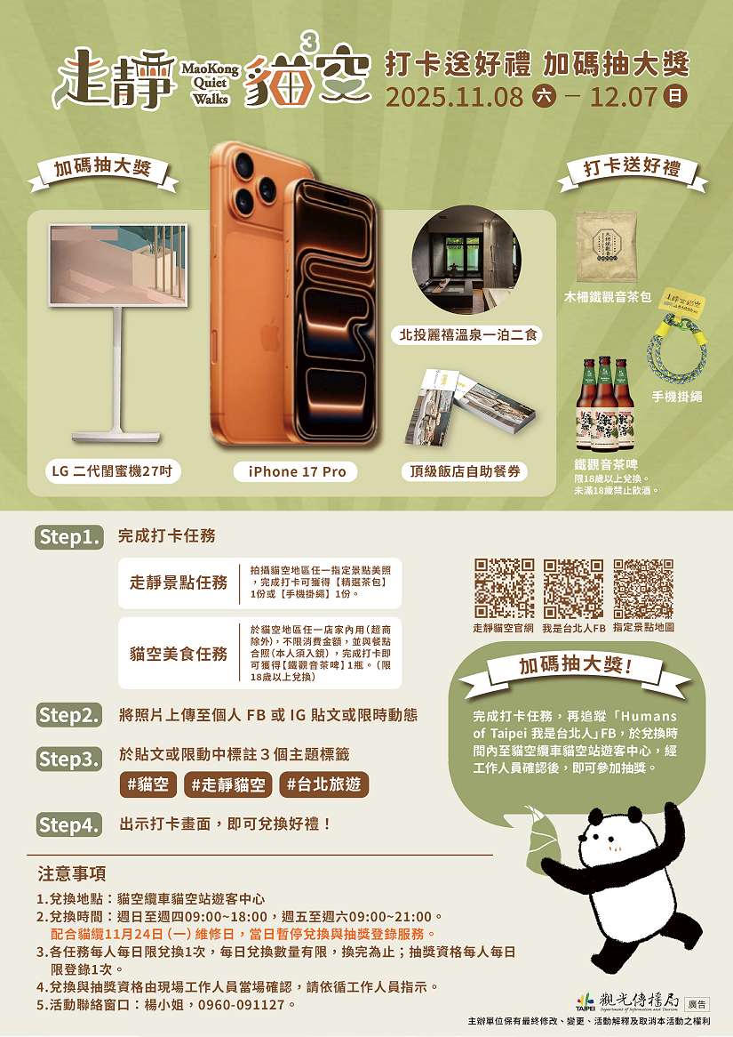 微風送爽,氣候宜人,正是造訪貓空、體驗山林之美的理想季節。臺北市政府觀光傳播局自11月8日起至12月7日推出「走靜貓空 打卡送好禮・加碼抽大獎」活動,只要完成指定打卡任務,即可獲得限量特色好禮;此外,再追蹤「我是台北人」臉書粉絲專頁,還可登錄資料參加抽獎,有機會把iPhone 17 Pro、LG StanbyME 2閨蜜機、北投麗禧溫泉雙人住宿券等總價值15萬元大獎帶回家。