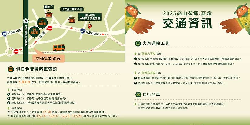 為方便民眾前來參與,假日特別規劃富裕路封街作為臨時停車場,並設置接駁車往返停車場與活動會場。接駁服務自上午10點開始,共安排三台接駁車輪流行駛,滿車即發,請民眾多加利用大眾運輸與接駁服務,安心、順暢抵達活動現場。