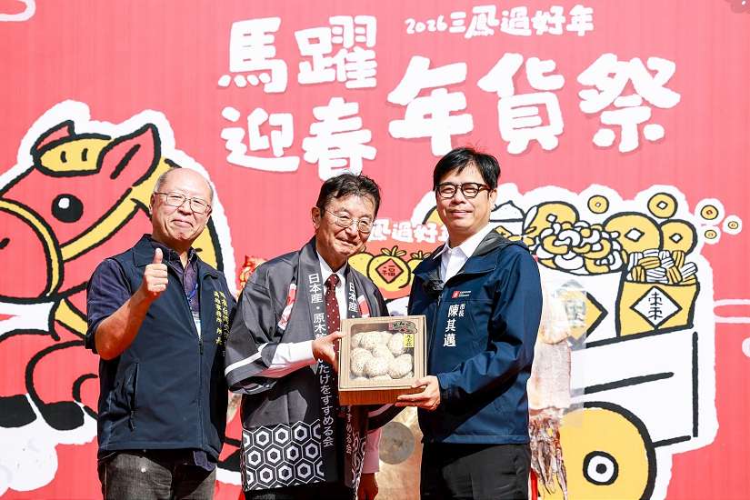 日本台灣交流協會高雄事務所長奧正史配合台灣年節習俗,致贈來自日本九州的頂級香菇禮盒給高雄市長陳其邁,表達新春祝福,並展現台日友好情誼-圖/高雄市政府提供