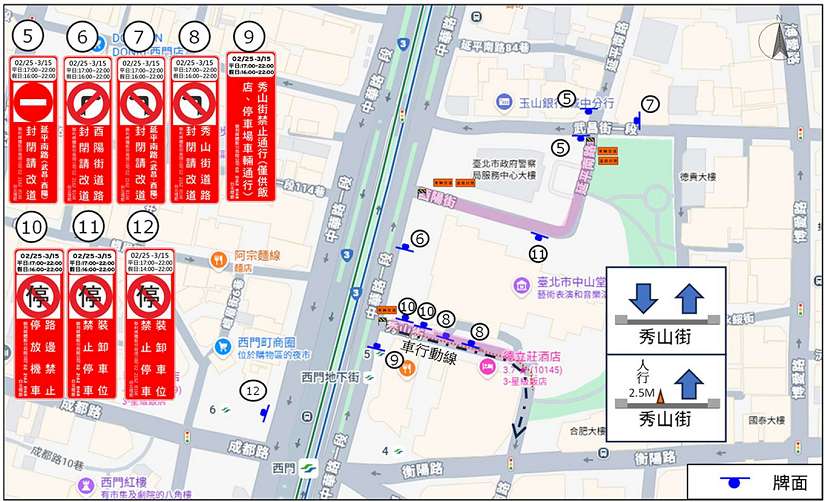 1、平日17時至22時及假日16時至22時,酉陽街、延平南路(武昌街至酉陽街)、秀山街管制車輛通行。