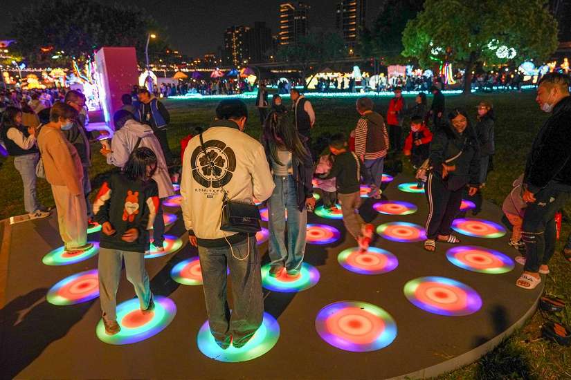 燈光隨著腳步閃耀變化,吸引親子族群排隊體驗-圖/新北市政府提供