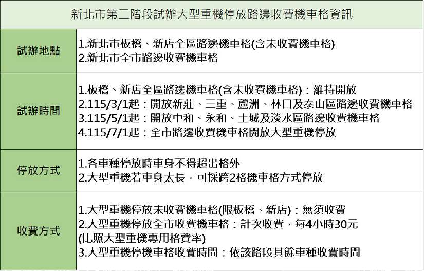 交通局停車營運科科長王昶閔表示,新北市自去(114)年8月起,已於板橋、新店2區率先試辦,開放約6萬8千餘格路邊機車格供大型重機停放;經觀察發現,「收費機車格」確實能有效調節汽、機車及大型重機停放需求,不僅提升車格周轉率,且能維持良好停車秩序;而非收費機車格因周轉率較低,整體紓解效果有限。