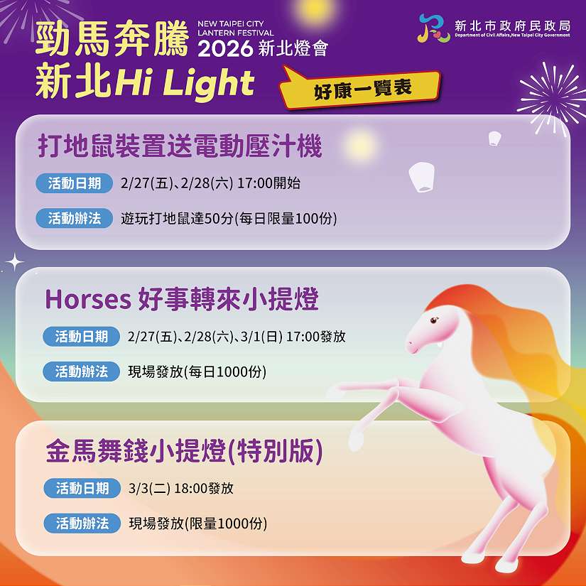 以及2月27日及28日,民眾只要參與現場互動裝置打地鼠分數達50分,即加碼贈送電動壓汁機,限量每日100份;2月27日至3月1日連假三日每天的17時也加發送一般版小提燈1000份,3月3日元宵節當天18時,更加碼特別版小提燈金馬舞錢1000份。