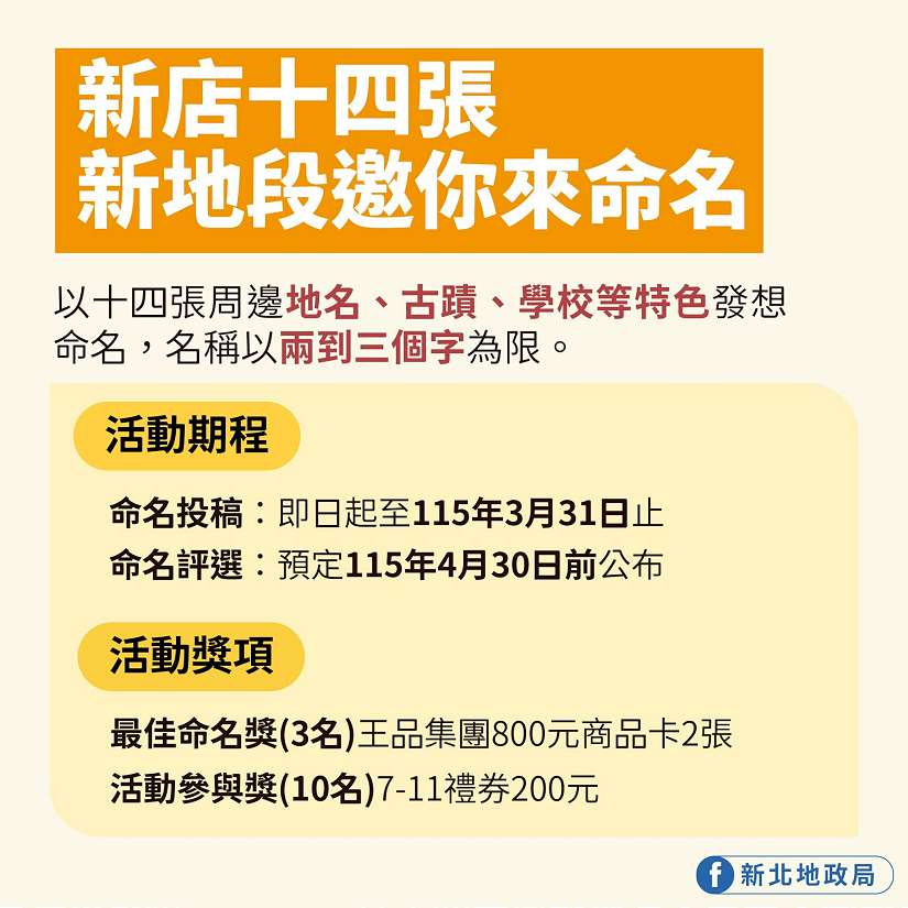 新北市地政局表示,新店十四張(B單元)區段徵收開發案目前施工中,未來將劃分為3個新地段,因此特別舉辦新地段命名活動,廣邀民眾以新店十四張周邊在地地名、歷史文化或生活意象發想命名,讓新的地段名稱兼具地方辨識度與人文底蘊。名稱以2至3個字為限,且不得與新店區既有地段名稱相同,即日起至3月31日止,可至線上問卷投稿參與。