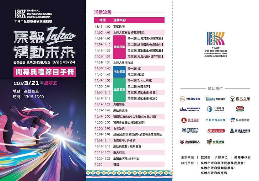 114年全國原住民族運動會睽違20年再度由高雄主辦,此次共匯集22縣市超過一萬名選手及隊職員參加,人數規模為歷年之最。這場兩年一度屬於原住民族運動員最高殿堂的開幕典禮,將於3月21日在高雄巨蛋盛大舉行,開幕典禮規劃一系列表演節目,包括世界合唱大賽金牌尼布恩合唱團及原住民傳統歌舞演出,免費入場,歡迎民眾報名觀禮。