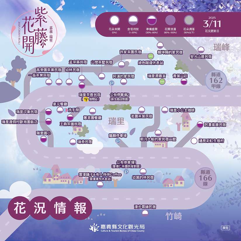 推薦民眾加入「慢遊嘉義」官方LINE@ (https://page.line.me/chiayitravel),不僅能查詢花況,還可查詢20家瑞里在地店家聯合推出之電子優惠券。近日天候多變,嘉義地區仍有陣雨,外出應攜帶雨具出門,留意溫度變化。