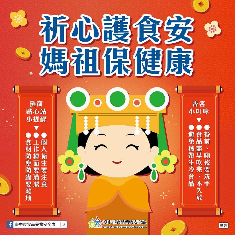 食安處補充,市府亦針對遶境期間鎮瀾宮周邊的攤商與餐飲業者,加強現場稽查,確保食品販售安全無虞。民眾亦可至「台中食藥安智慧雲-食安 GIS 專區」(https://gov.tw/eyJ)查詢最新食安資訊,一同守護健康、祈願平安。