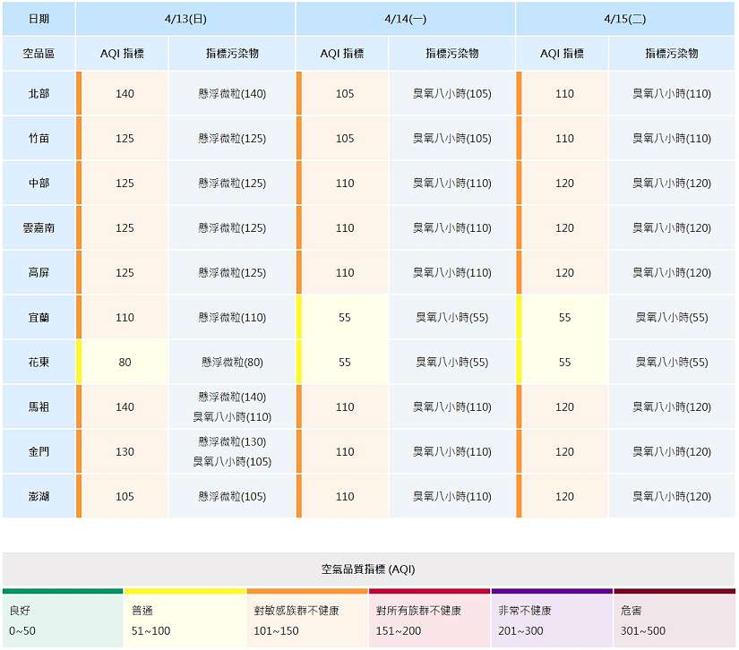 環保局指出,今日受東北季風影響,環境風場為偏北風至東北風,偏北風挾帶境外污染物影響台灣及離島,影響程度視降雨情況及上游污染物累積而有所變化;14日東北季風減弱,環境風場為偏西風至西南風,偏西風可能挾帶境外臭氧移入影響台灣及離島,影響程度視降雨情況及上游污染物累積而有所變化。