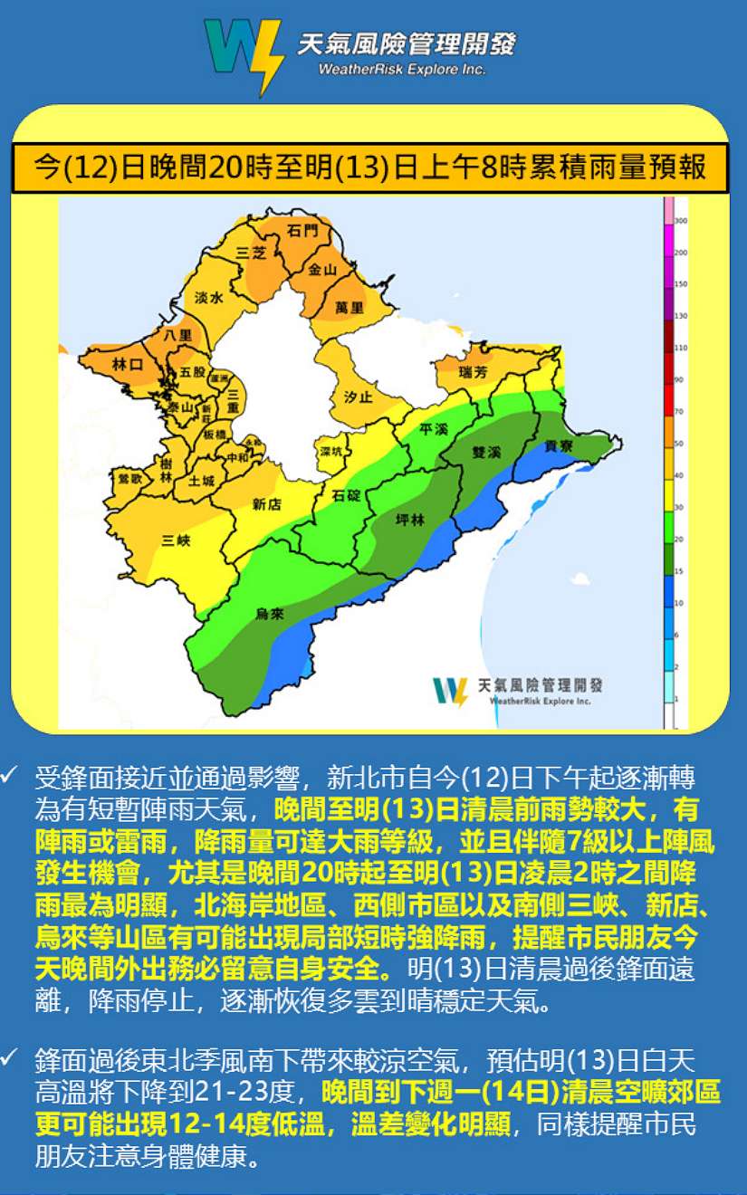 依據交通部中央氣象署及新北市氣象團隊天氣風險公司研判天氣資 訊,新北市(12)日受鋒面接近並通過影響,自昨日下午起逐漸轉為有短暫陣雨 天氣,尤其是晚間 20 時起至今(13)日凌晨 2 時之間降雨最為明顯,降雨量可達大雨等級,並且伴隨 7 級以上陣風發生機會,其中北海岸地區如淡 水、三芝、石門、金山、萬里;西側市區如林口、八里、新莊、板橋、三 重、樹林、鶯歌等;南側山區如三峽、新店、烏來等,皆有可能出現局部 短時強降雨。