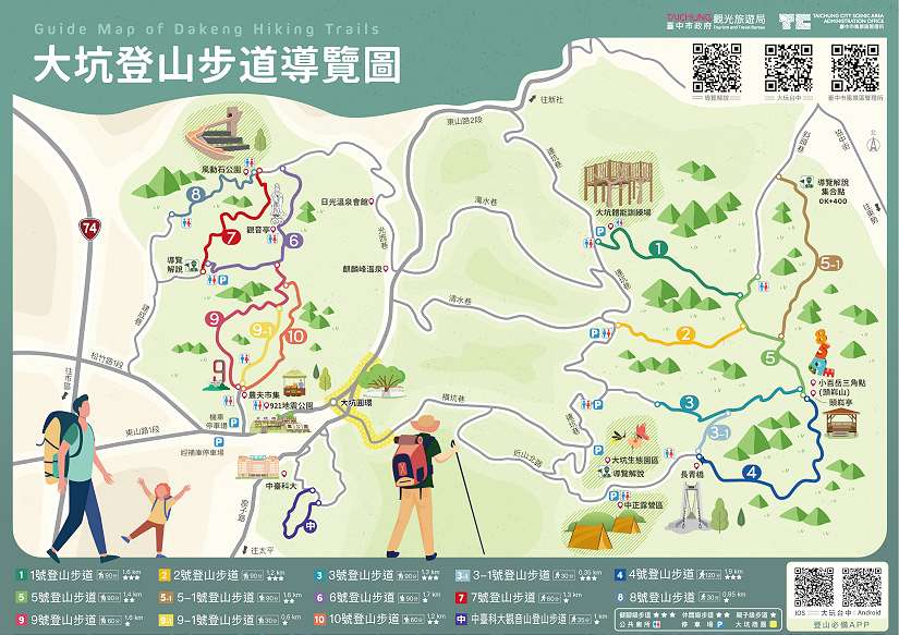 觀旅局表示,大坑風景區的登山步道目前共計14條,市府強化推展步道特色,1號「健身步道」、2號「彩色森林步道」、3號及3-1號「鳥語步道」、4號「蝴蝶步道」、5號「山林縱走步道」、5-1號「手作文學步道」、6號「仙境步道」、7號「藥用植物教學步道」、8號「遊戲步道」、9號及9-1「愛戀步道」、10號「特產步道」、11號中台科大觀音山「能量步道」,每條步道都極具特色魅力。