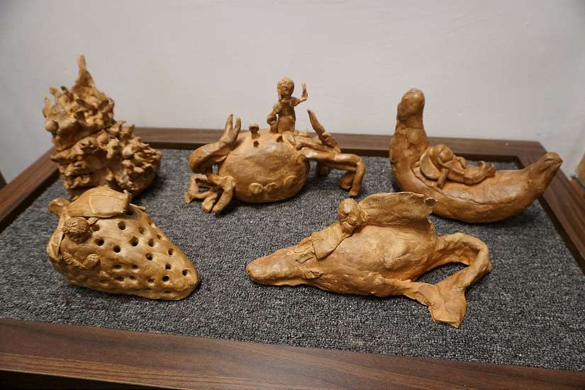 另外,美術班四年級王同學對於這次展覽也表示,雖然現在超市林立,購買日常所需食材方便,但是直到現在,假日時常仍會與家中長輩一大早到學校附近市場採買,傍晚時分則會到黃昏市場走走逛逛,夜晚有空閒時會與家人走訪夜市吃美食。為了這次展出在課堂上透過陶藝、水墨、版畫和水彩等不同的藝術媒材,從不同角度呈現市場的獨特氛圍和細節,並且體驗藝術創作的多樣性和樂趣。