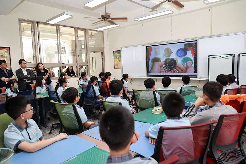參觀陶藝教學,指導老師透過實物投影機,將放大的影像直接投映在教室螢幕上,許縣長稱讚這套設備「影像清晰、畫質又好!」,可以提高孩子專注力,學習效果可以更好,感謝秀育企業的捐贈。