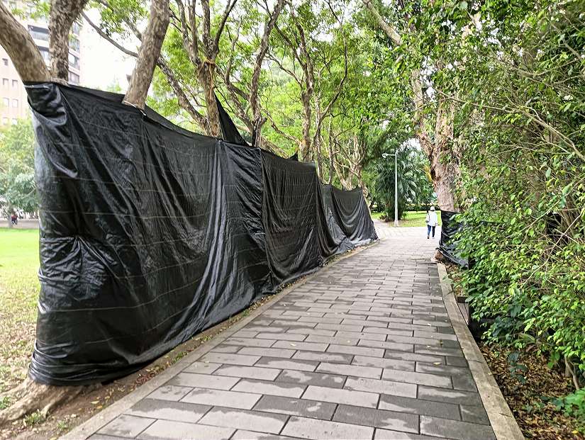 公園處於賞螢季期間,在生態池外側架設黑網,以減少大樓燈光投射的光害-圖/台北市政府提供