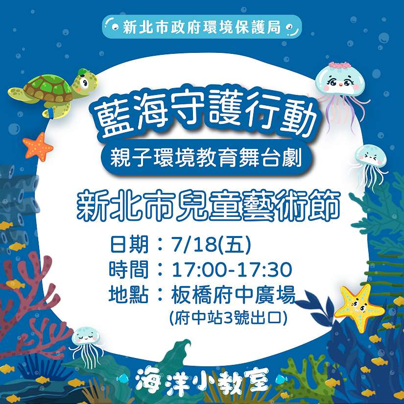 為推動民眾海洋環保意識,新北市環保局即將推出全新原創親子環境教育舞台劇《藍海守護行動》巡迴演出,7月18日(星期五)下午5時將在板橋府中廣場首次登場。首場演出特別結合新北市年度親子盛會「兒童藝術節」,期望透過藝術與教育的結合,提升市民對環境永續的關注與參與。現場規劃環保問答、互動教學、帶動跳等趣味內容,邀請大小朋友一起走進繽紛海洋劇場,從戲劇中汲取愛海護海的行動力!