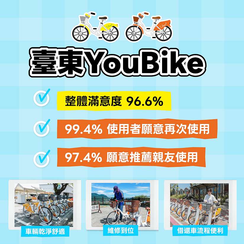 為推動低碳交通、打造永續城市,臺東縣自113年12月引進YouBike 2.0公共自行車以來,營運成果屢獲民眾及遊客肯定。臺東縣環境保護局於今(114)年7月辦理「114年臺東縣YouBike服務滿意度問卷調查」,結果顯示,民眾對於YouBike的整體滿意度高達96.6%,再次使用意願達99.4%,而願意推薦親友使用的比例更達97.4%,充分展現公共自行車服務已深獲縣民喜愛。