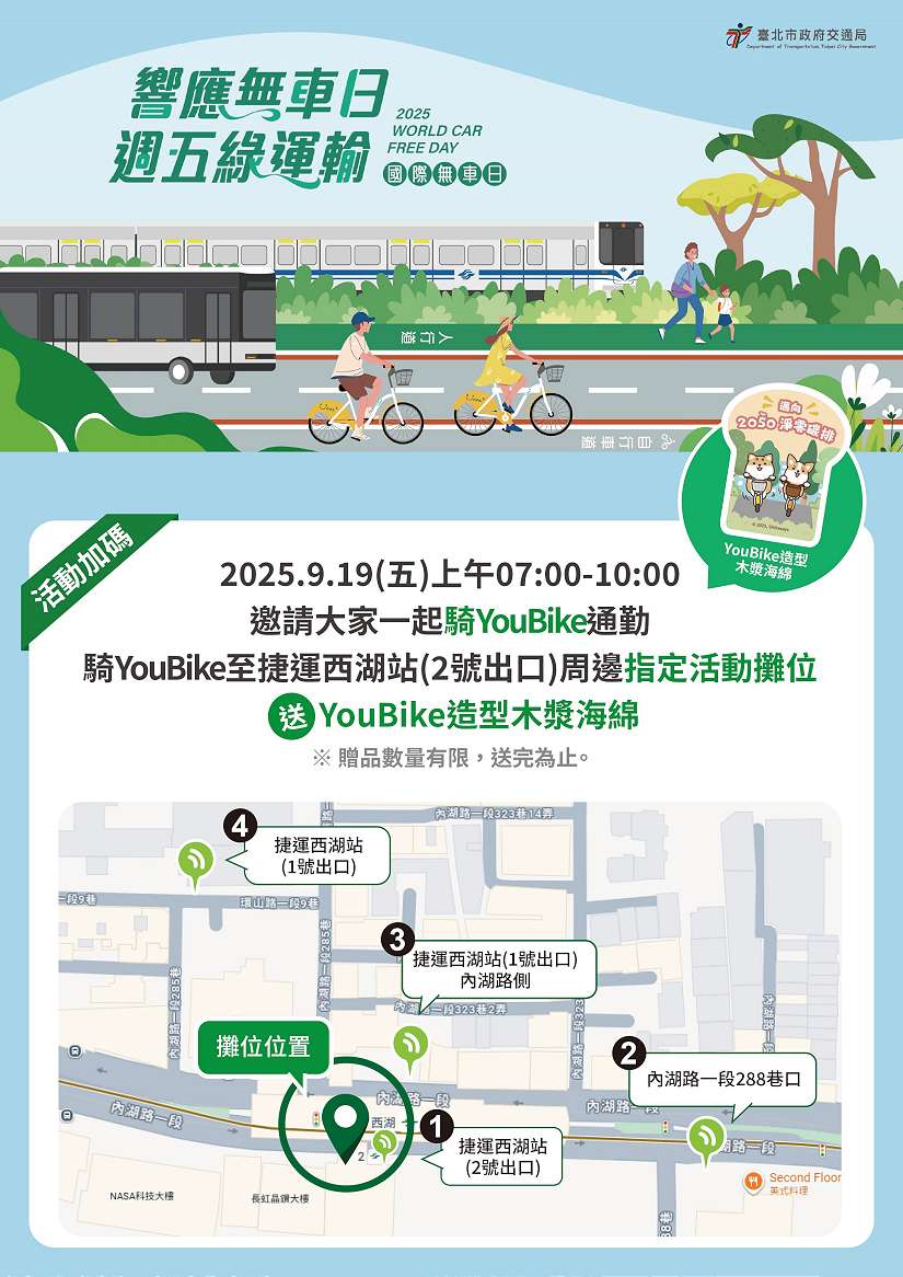 本週五(9月19日)上午7時至10時,民眾只要搭乘綠運輸並攜帶環保杯,可至YouBike捷運西湖站(2號出口)、捷運市府站(出口2)、捷運南京三民站(出口4)及捷運中山站(出口1)等站點,並在臺北市政府交通局粉絲專頁指定貼文按讚分享,就送濾掛咖啡1包;同時,現場貼上「響應無車日、週五綠運輸」行動勳章貼紙,還可以用環保杯領一杯提振精神的咖啡,數量有限,送完為止。