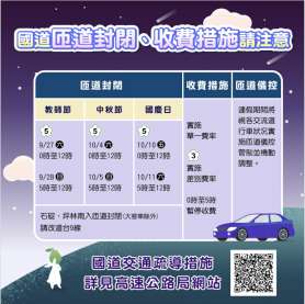 高速公路局為使連假期間國道車流順暢,連續假期間0時至5時,國道暫停收費;另請注意國5石碇、坪林南下匝道將於連續假期第一日(9/27、10/4、10/10)0時至12時、連續假期第二日(9/28、10/5、10/11)5時至12時封閉管制,請用路人改駛台9線;建議出門前可利用1968 App及高速公路局官網查詢最新國道管制和即時路況,盡量避開尖峰時段上路。