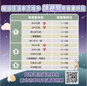 交通局提醒連假期間出遊及返鄉民眾,可多加利用「新北市即時交通資訊網」,隨時查詢即時路況、即時影像、掌握最新交通訊息,以避開尖峰車潮;也請民眾前往淡水老街、九份老街等熱門風景區時,最好避開在中午後人潮湧現易壅塞時段,並注意停車場滿場管制,建議民眾利用大眾運輸工具前往。