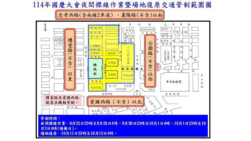 114年國慶籌備委員會訂於9月25日至26日、9月30日至10月1日在總統府前及周邊道路實施參演單位夜間標線作業;另10月7日至10日執行光雕投影等活動。