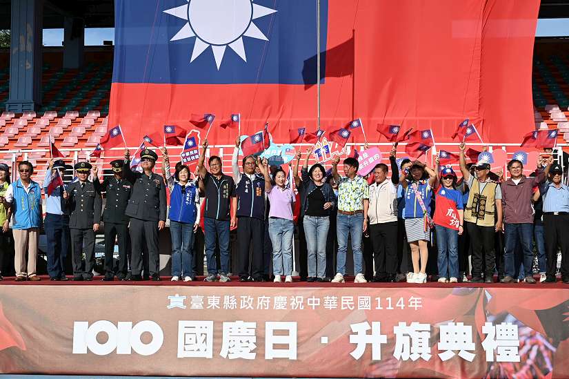 為慶祝中華民國114年雙十國慶,臺東縣政府於今(10)日在縣立體育場舉行升旗典禮,現場湧入約3,000名鄉親,熱情揮舞國旗,熱烈參與。縣長饒慶鈴帶領民眾高唱國歌,祝賀中華民國國慶日。