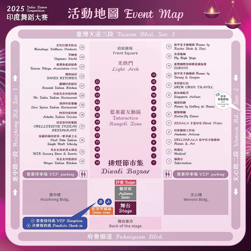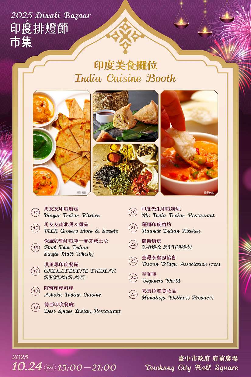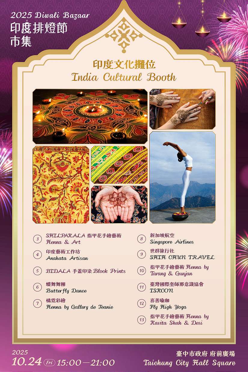 為慶祝印度最重要的節慶之一「排燈節」(Diwali),印度台北協會與台中市政府攜手合作,將於10月24日(星期五)下午3時至晚間9時,在台中市政府府前廣場舉辦「2025印度舞蹈大賽暨排燈節慶典」。民政局長吳世瑋表示,活動當天除有印度舞蹈決賽,現場並設有充滿節慶氛圍的印度特色市集,提供多樣美食、手工藝品與文化體驗,歡迎市民朋友一同體驗印度多元繽紛的文化魅力,分享節慶的喜悅與祝福。