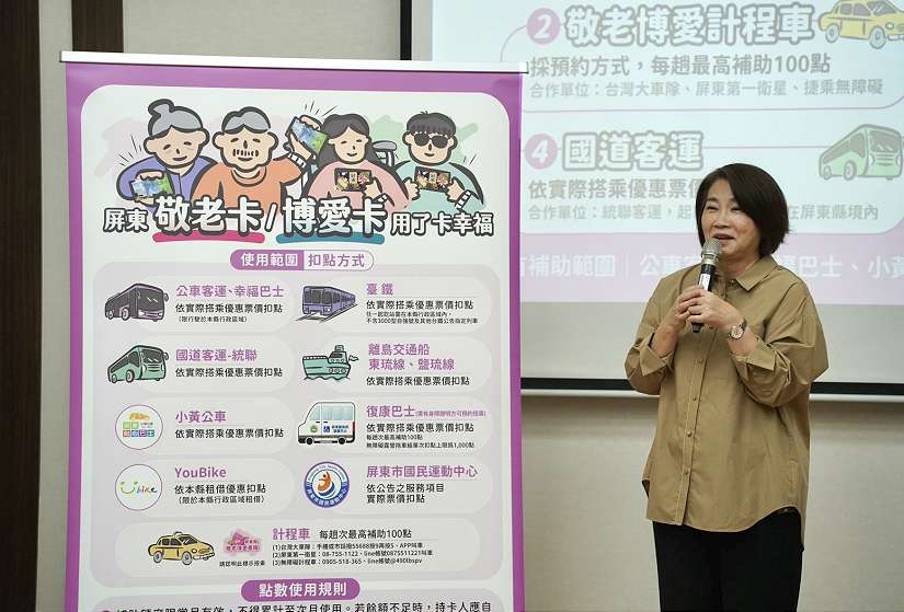 為鼓勵長輩及身心障礙者們多外出、促進身體健康,屏東縣長周春米(20)日於縣府媒體室宣布自114年11月1日起,敬老卡及博愛卡每月補助點數將由500點提升至1,000點,並擴大使用範圍至計程車、復康巴士、國道客運及航運等「5大升級」措施,預計有22萬名長輩及身障者受惠,周縣長強調,此次升級不僅是金額的提升,更是對長輩日常生活便利性與交通平權的重要承諾。