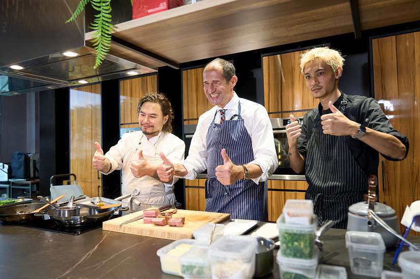隨後谷力哲處長與副市長鄭照新、經發局長張峯源體驗歐式料理,由私廚選用在地優質食材,透過歐式手法精心烹調,兼顧視覺、味覺與嗅覺享受,述說主廚獨特的跨國小故事,讓谷力哲處長感受台中多元包容的國際文化;享用主菜時,谷力哲處長更穿上圍裙,親自為賓客分切烤肉,動作熟練、態度親切幽默,化身「外交大廚」。