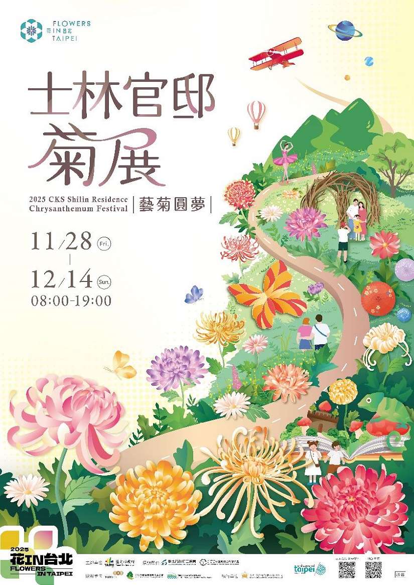 園藝管理所吳旻靜主任補充,今年的主視覺海報暗藏展場路線巧思。從士林官邸花卉大道起步,遊客將依序穿越以童話故事為靈感的夢花園、充滿日式風情的和傘花徑、象徵蛻變的蝴蝶意象,再走入代表幸福的家園,最後搭乘熱氣球環遊世界,展開一段追尋心願的旅程。整條動線如同人生的時間軸,串連起築夢的每一個階段,沿途綻放的菊花宛如生命歷程的映照在成長的每個時刻,都能綻放屬於自己的光彩。