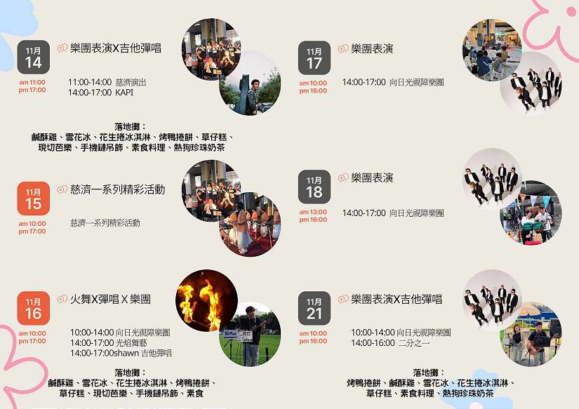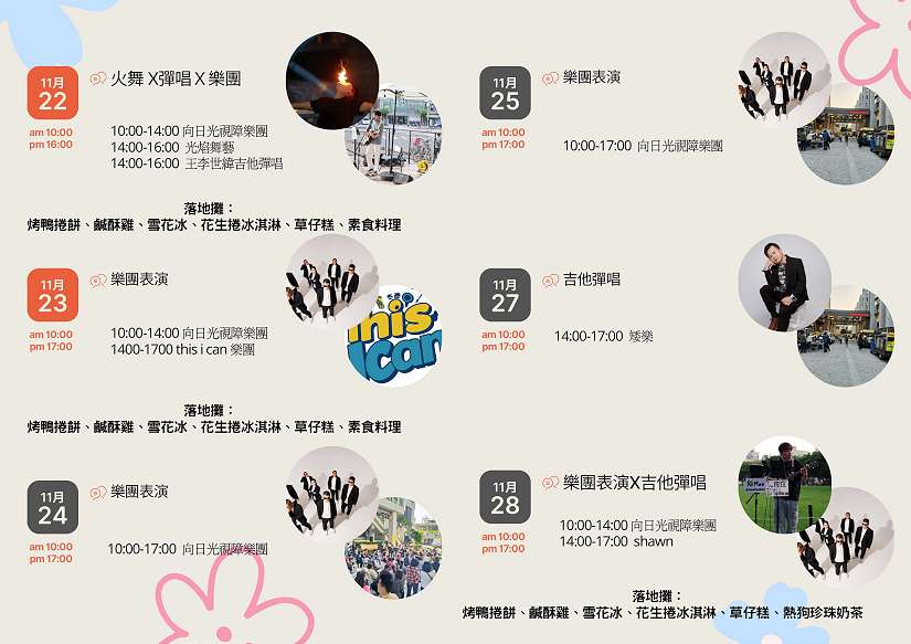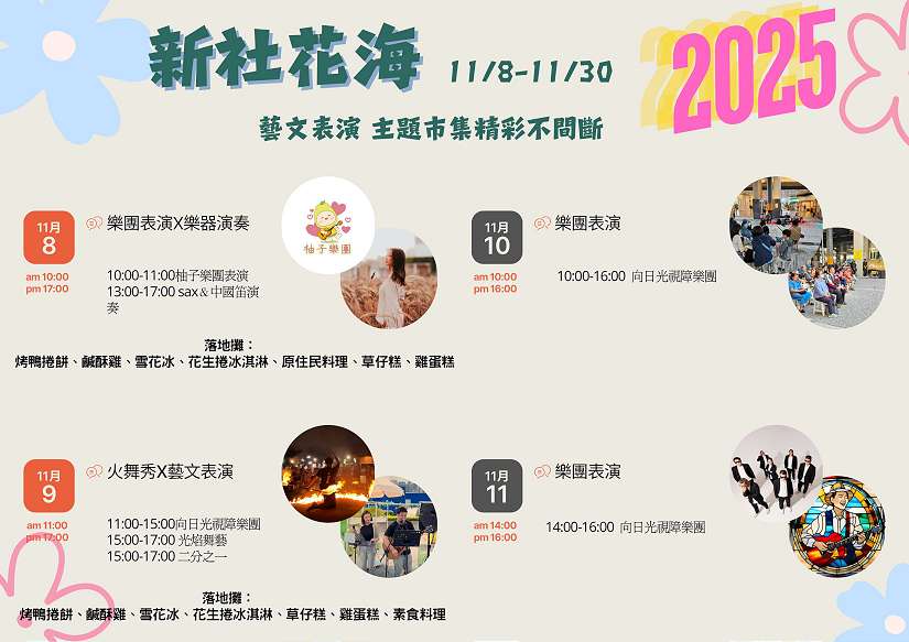 交通局說明,活動期間豐原轉運中心化身歡樂嘉年華,將於11月8日至11日、11月14日至18日、11月21日至25日、11月28日至30日,連續四週安排多組藝文團體接力演出,包括樂團表演、吉他彈唱、中國笛演奏及向日光視障樂團等,讓等車旅客也能享受音樂與藝術氛圍。現場同時設有主題餐車市集,集結多款在地美食與特色小吃,讓賞花旅程更添風味。