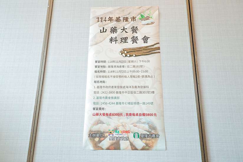 基隆市年度盛事「山藥大餐」將於11月22日(六)晚上6時在基隆港海產樓登場,由基隆市政府與基隆市農會共同主辦,活動以創意料理推廣基隆在地農產「山藥」,讓民眾體驗山海交織的美味饗宴。市府今(12)日舉辦活動宣傳記者會,副市長邱佩琳表示,活動餐券將於11月13日(四)上午9時開賣,數量有限,歡迎市民朋友踴躍參與。