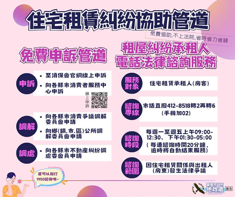 另外也可以撥打1950全國消費者保護專線,會有專人提供諮詢服務,租屋糾紛承租人電話法律諮詢服務:(免費諮詢,無須負擔律師費)