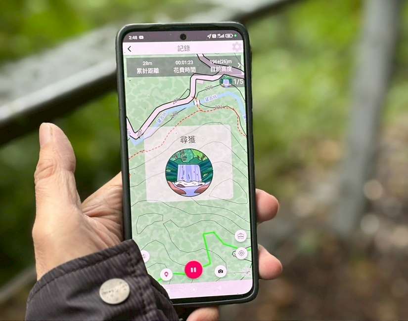 APP顯示參與者完成任務並成功尋獲寶石。畫面同步記錄累計距離、花費時間與目前高度等健行資訊-圖/新北市政府提供