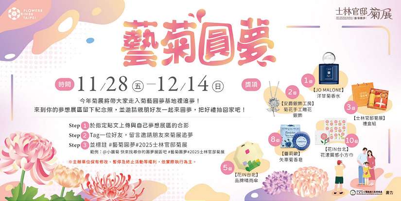 公園處藍舒凢處長表示,士林官邸菊展是臺北年度知名盛事,每一朵菊花的盛放都凝聚了園藝團隊的智慧與辛勤,尤其在氣候挑戰下仍能綻放,更顯珍貴。展期間除了靜態花卉展示,更有精彩的例假日表演、現場及線上更有「圓夢繪馬」、「藝菊圓夢」粉專互動活動及限量菊展小禮,邀請民眾攜家帶眷共享花藝之美。今年菊展持續與士林及天母周邊商家合作,賞花同時享專屬消費優惠,並可參與田園城市系列活動與文創市集,探索在地特色與異國風情。相關活動內容可至「花I N台北」官方網站查看,更可以加入「士林官邸旅客」粉絲專頁了解最新消息。