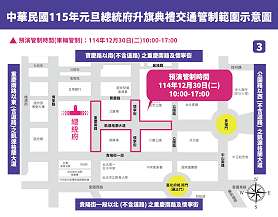 配合115年元旦總統府升旗典禮活動,總統府周邊區域自114年12月27日8時起,分階段實施設備搭建作業、升旗典禮預演、元旦升旗典禮等各項交通管制措施,請民眾注意交通管制訊息,並請配合改道。