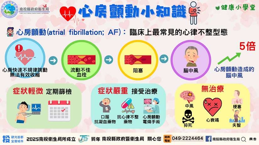 另縣府衛生局也提供-心房顫動(AF)手冊供民眾參閱,或查詢縣府衛生局網站 https://www.ntshb.gov.tw/ 首頁/便民服務/衛教宣導圖卡/醫療資源。