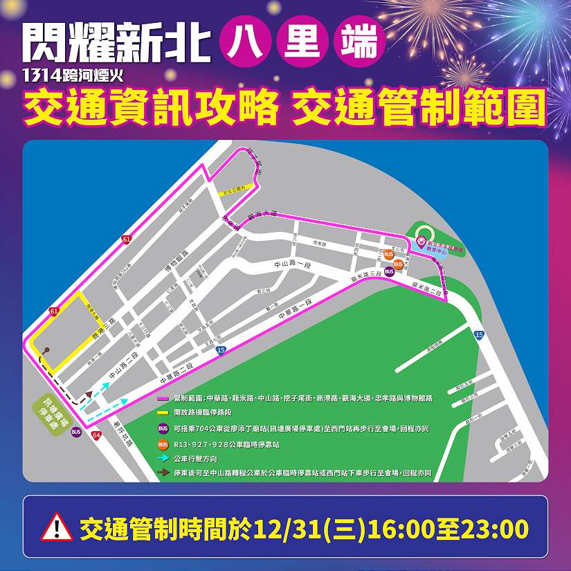 為確保活動順利進行,12月31日下午4點至晚間11點,淡水漁人碼頭及八里左岸周邊將分時、分區實施交通管制。淡水端中正路二段51巷將禁止汽、機車及自行車進入,並配合人潮狀況進行分流引導;八里端亦將視停車場容量與人流狀況,啟動道路封閉與車輛管制措施,請民眾配合現場警義交及工作人員指揮。