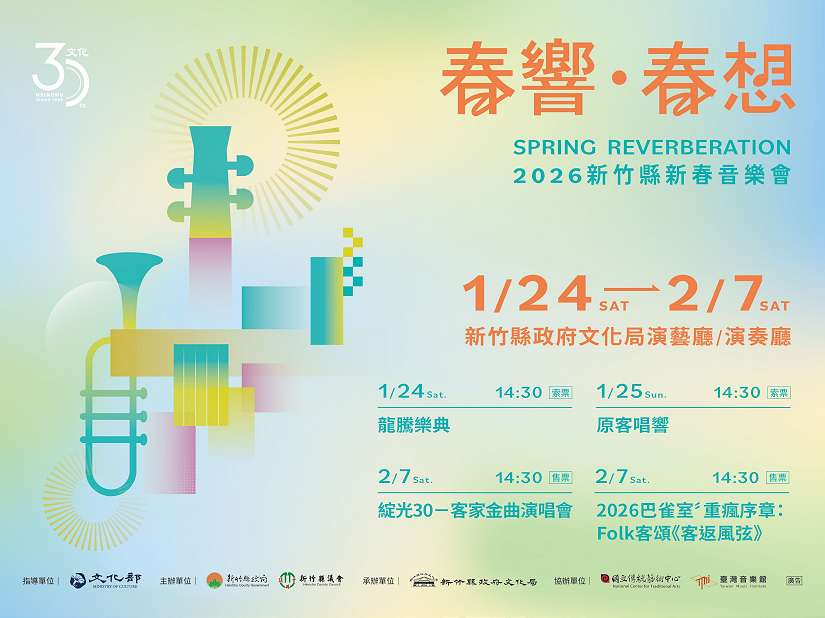 新春伊始,樂聲為序!「春響‧春想—2026新竹縣新春音樂會」從1月24日到2月7日,推出氣勢磅礴的交響樂、承載記憶的原住民族古調,到原住民與客家合唱,以及由優秀臺灣音樂家組成的室內樂團,為觀眾帶來4場跨越文化與世代的音樂饗宴。歡慶文化局成立三十週年,〈龍騰樂典〉、〈原客唱響〉、「綻光30—客家金曲演唱會」等3場演出有摸彩活動為新春添喜,獎項包含 Marshall Emberton III 攜帶式藍牙喇叭及 HomePod mini,縣長楊文科邀請大家相約走進音樂廳,以動人的旋律迎接新年,用音樂啟動希望。