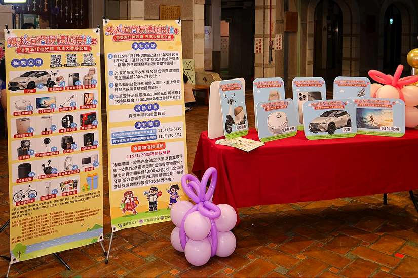 「暢遊宜蘭好禮加倍抽2.0活動」活動期間自115年1月1日起至115年5月11日止,全國民眾於宜蘭縣內合法旅宿業者、觀光工廠、休閒農場、博物館家族、蘭陽原創館、本縣轄借問站、歷屆好食/好物/好羹獲獎商家、JINHO宜蘭敬好生活、宜!蘭青創品牌、宜蘭嚴選之商家、頭城五漁鐵獲獎商家等指定商家,消費並取得發票或消費購物證明後,於活動官網完成登錄,滿仟即可參與抽獎,不同張次的發票,消費金額可合併計算。獎項內容多元豐富,包含汽車、電動機車、智慧型手機及按摩椅等多樣好禮,讓民眾在暢遊宜蘭、買好物吃好料、抽大獎,一次享受三重樂趣。