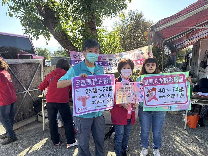 現場還安排子宮頸癌及乳癌篩檢服務,篩檢對象包括:一、子宮頸抹片檢查:25歲以上女性(曾有性行為者,每3年至少1次)。二、乳房攝影檢查:40至74歲女性(每2年1次,含40至44歲且二等親內有乳癌病史者)。