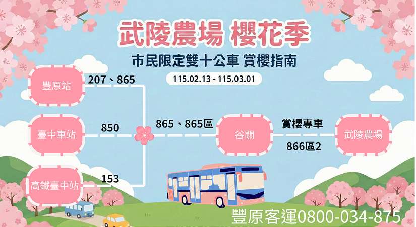 更多接駁資訊可至豐原客運官網查詢,或撥打豐原客運客服專線詢問(04-25234175);武陵農場櫻花季交通管制措施詳情可至「公路局115年武陵農場櫻花季疏運專頁」查詢( https://reurl.cc/G5DgVp )。