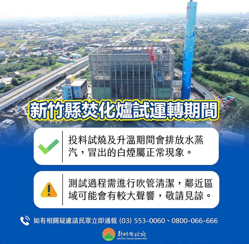 新竹縣焚化爐各項測試若順利,將逐步提升運轉能量,試營運期間約為3至4個月,待取得使用執照及通過消防安全設備審查等才會開始商轉,力拚年中正式商轉。試運轉期間所面臨的水蒸氣排煙及噪音問題均會向當地里長說明,環保局將持續優化焚化爐設施,請民眾放心。