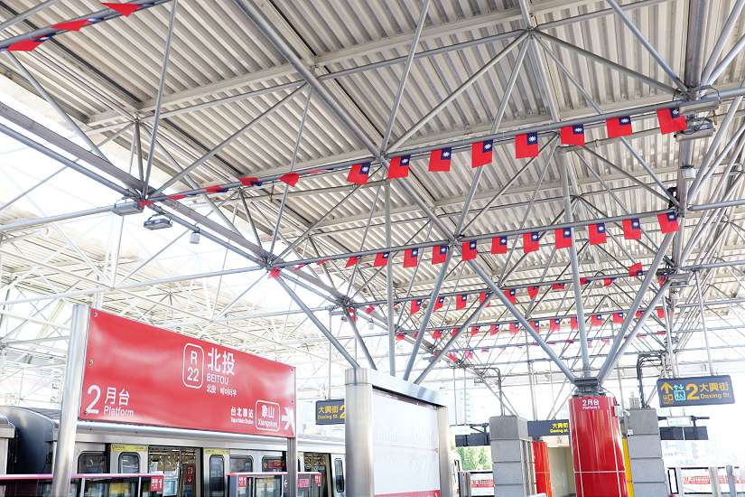 此外,臺北捷運於轉乘站、鄰近重要機關及出入境路線車站的大廳閘門旁懸掛國旗,與旅客共享國慶榮耀時刻。其中,北投站更特別將國旗設置於半戶外月臺上方,陽光灑落、旗幟隨風飄動,與天空相映成趣,成為旅客眼中最動人的國慶風景。