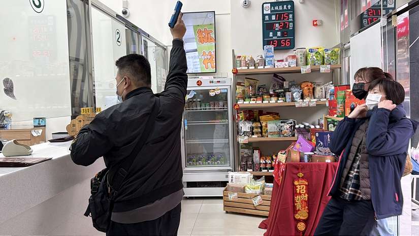 年關將近,為加強金融機構對強盜、搶奪等案件之應變能力,土城警分局於昨(27)日下午2時聯合土城農會永豐分部舉辦防搶演練,由兩名警察同仁假扮鴛鴦大盜持槍闖入農會,對空鳴槍脅迫行員及人質交出錢財,俟歹徒得手巨額贓款後隨即開車逃逸,行搶過程太過逼真,令一旁行人驚呼不已,經員警解釋才拍胸直呼太嚇人了。