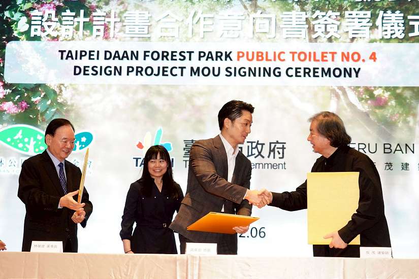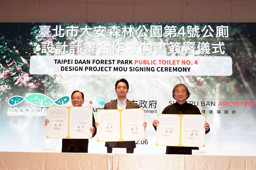 臺北市政府持續推動「公廁2.0」改造計畫,致力翻轉民眾對傳統公共廁所老舊、陰暗、不易使用的刻板印象。臺北市長蔣萬安(6)日出席「大安森林之友基金會」與「坂茂建築設計事務所」合作備忘錄(MOU)簽署儀式,見證大安森林公園4號公廁改造計畫正式啟動,展現公私協力提升公共環境品質的具體行動。